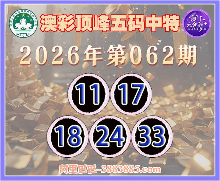 062期:【澳彩顶峰】 👘五码中特👘【11.17.18.24.33】开:24