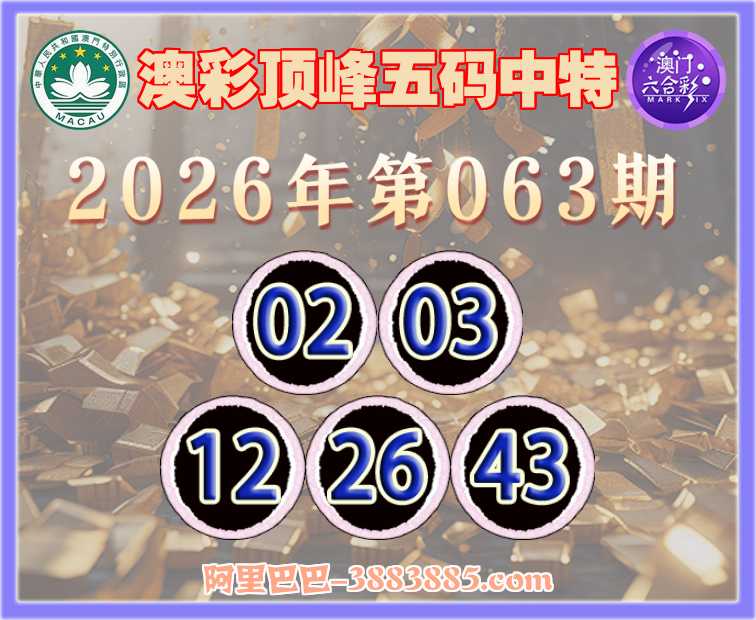 063期:【澳彩顶峰】 👘五码中特👘【02.03.12.26.43】开:28